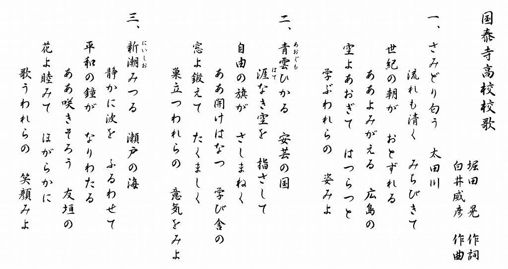 新生国泰寺にふさわしい校歌がほしいと,1950年7月に広く校内に呼びかけて歌詞を募集した。定時制生徒堀田晃君の作が入選。当時の音楽科講師白井威彦先生が作曲し,10月1日に制定された。